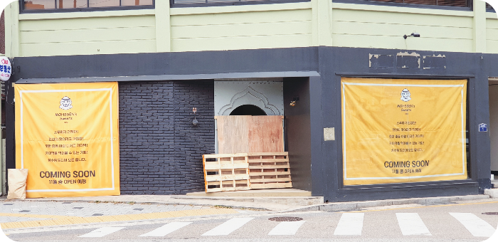한국어로 힙하다는 단어는 묘한 마력을 가지고 있습니다. 힙한 동네라는 생각 때문인지 이렇게 짓다만 상가도 그럴듯해 보입니다. 힙함을 찾아 저 판자를 치우고 난입하고 싶은 본능, 이것이 사람들을 끌어모으는 이유일까요? (아, 저는 맹세코 들어가지 않았습니다,, 판사님.. )